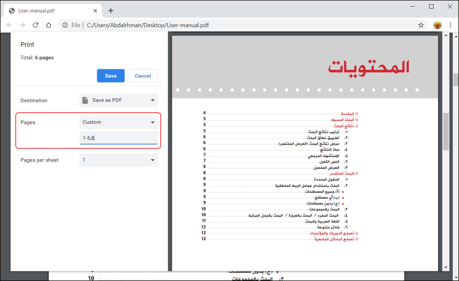 بعد تشغيل متصفح Chrome على جهازك، قم بسحب وإفلات مستند PDF داخل نافذة المتصفح ليتم عرض محتوياته مباشرًة. الآن ما عليك سوى أن تضغط على أيقونة الطابعة (🖨) في الزاوية العلوية اليمنى، أو على مفتاح Ctrl + حرف P معًا، لفتح نافذة إعدادات الطباعة. الآن، أضغط على قائمة Destination ثم حدد منها خيار “Save as PDF” ومن ثم اختر “Custom” من قائمة Pages لتقوم في الحقل التالي بإدخال أرقام الصفحات التي تريدها في ملف PDF منفصل.