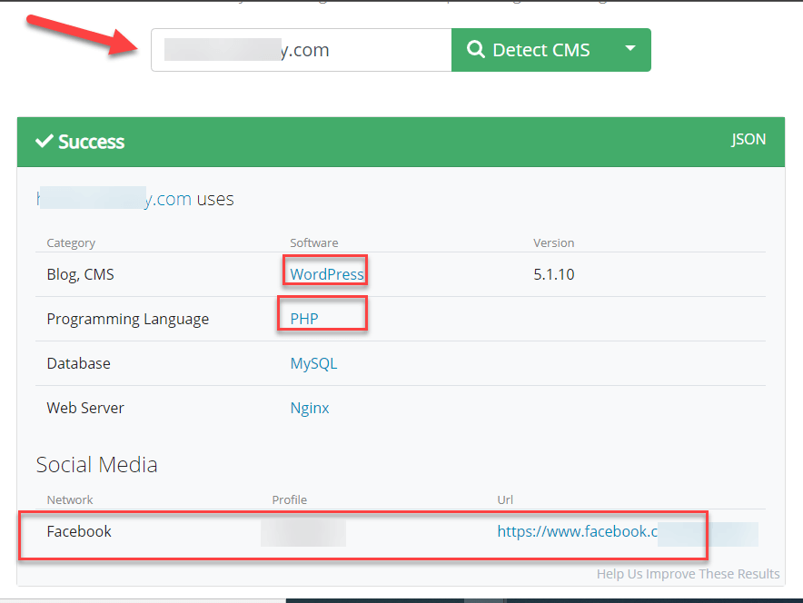 كما توضح الصورة السابقة فإنه بمجرد الدخول إلى الأداة ولصق رابط الموقع المراد الكشف عنه، ستخبرك الأداة ببعض البيانات الهامة حول الموقع. الصورة السابقة مثال عملي لنتيجة اختبار أحد المواقع والتي حصلنا منها على اسم نظام إدارة المحتوى المستخدم وهو WordPress وكذلك الإصدار الحالي لنسخة الووردبريس المُستخدمة.