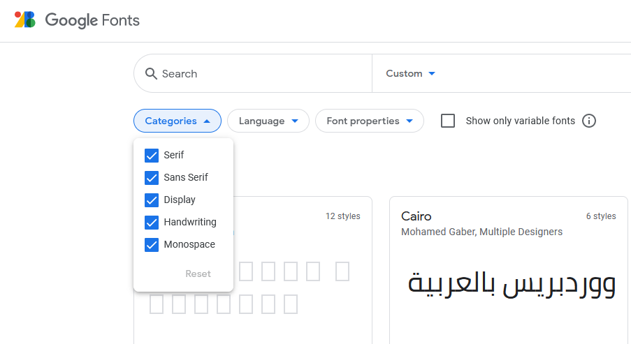 كما قلنة أن منصة Google Fonts من أفضل المنصات التي تستطيع الإعتماد عليها للحصول على خطوط مخصصة لموقعك بما أنه يضم مجموعة كبيرة من الخطوط التي تستطيع معاينتها بشكل لحظي، وكما أنه يوفر تجربة سهلة في تحميل واستخدام تلك الخطوط في موقعك، وبالتالي سنقوم بعمل تجربة للحصول على خط مخصص من تلك المنصة.