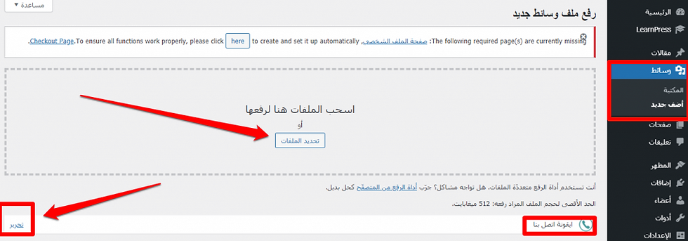 يمكنك تغيير الزر إلى أيقونة مخصصة للاتصال الهاتفي، وذلك من خلال التوجه إلى الوسائط لرفع صورة جديدة، ثم قم برفع الأيقونة بسحبها الى المكان المخصص لها أو النقر على تحديد الملفات, ورفعها من حاسوبك