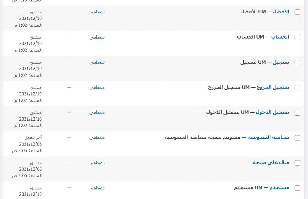 يمكنك أن تستعرض كافة الصفحات المرتبطة بنظام العضويات مباشرةً من خلال قسم (الصفحات) في موقعك الووردبريس، وذلك حيث إن الإضافة قد أنشأت صفحاتها الخاصة في بادئ الأمر: