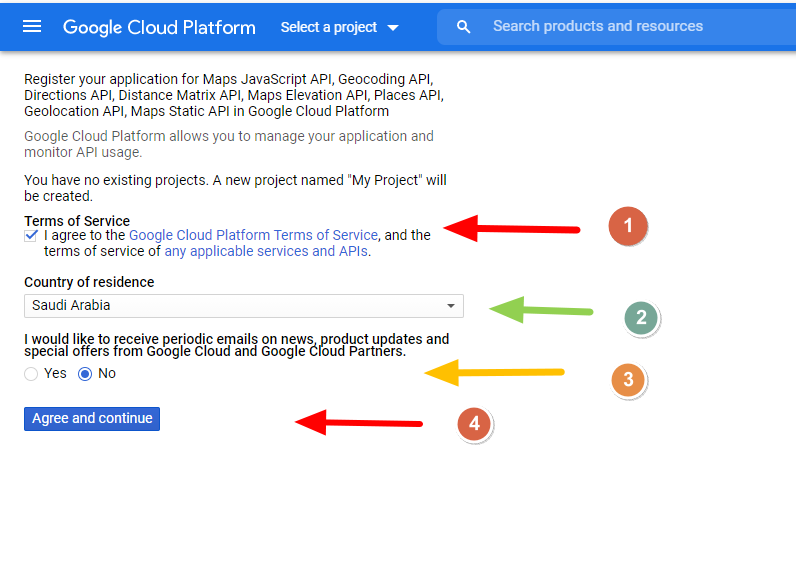 سيتوجع عليك الآن إدخال بعض المعلومات للحصول على API Key، وذلك من خلال الموافقة على الشروط وتحديد الدولة الخاصة بك وتحديد إذا كُنت تريد إرسال رسائل إلى البريد الإلكتروني الخاص بك.