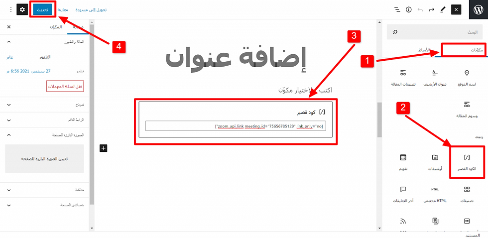 لقد انتهينا للتو من إعداد كافة التفاصيل اللازمة لتضمين اجتماعات الزوم في موقعك الإلكتروني، وتبقى فقط إدراج الأحداث والاجتماعات بشكلٍ مباشر من داخل الموقع والخطوات التالية توضح ذلك: