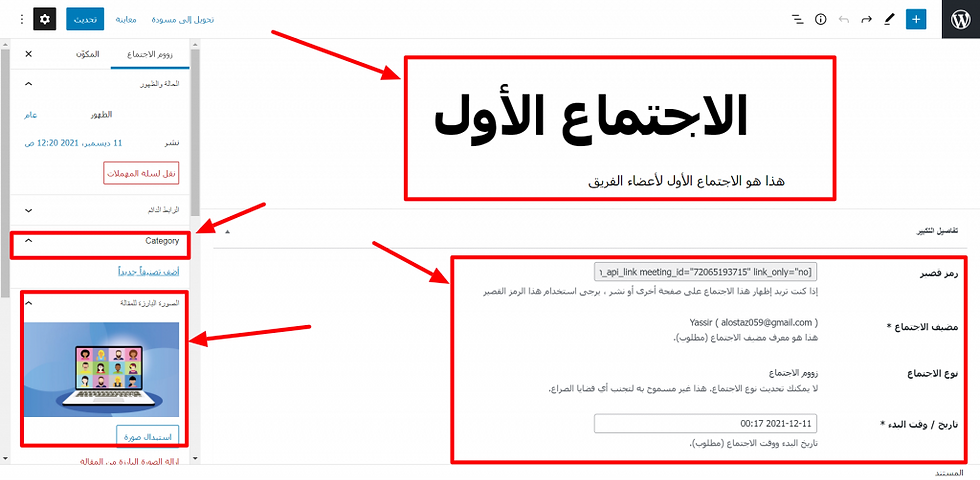 وأي من هذه الطرق عند استخدامها يكون معها كود/رمز قصير “short code”؛ لتضمين الاجتماع في أي مكان نريده في صفحات الموقع، وسنجرب هنا إضافة عنوان آخر لاجتماع آخر باسم “الاجتماع الأول”.