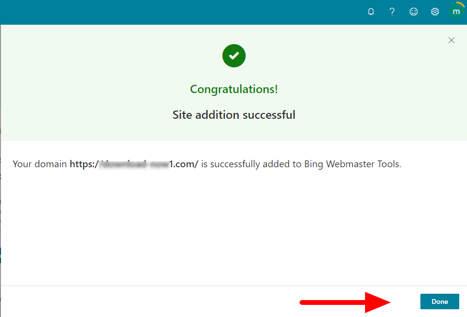 ستظهر لك نافذة بعد ذلك، تفيدك بنجاح عملية التحقق وإضافته إلى مشرفي المواقع لمحرك البحث بينج