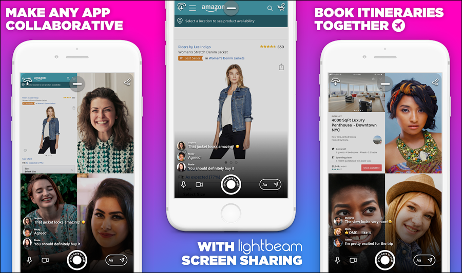 يوفر Lightbeam ميزات مماثلة إلى حد كبير إلى Squad المذكور أعلاه إلا أنه يبرز قدرته الفريدة في مشاركة شاشة الهاتف. إذ يظل بإمكانك إجراء مكالمة فيديو وبث الشاشة في نفس الوقت. لكن Lightbeam قام أيضًا بدمج التعليقات المباشرة داخل نافذة مشاركة الشاشة.