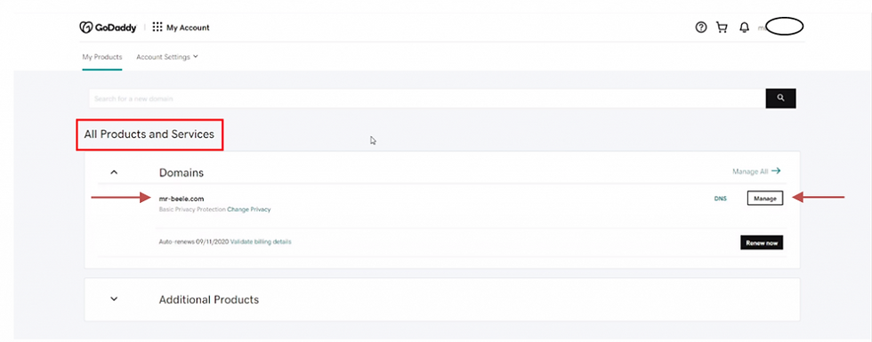 كما ستجد المنتجات والخدمات الخاصة بك في القسم (All Products and Services) عند اسم الدومين الخاص بك والمراد نقله قم بالضغط على الزر (Mange) كما هو موضح في الصورة التالية.