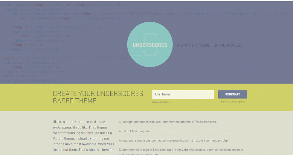 أول شيء سنقوم به هو إنشاء قالب بدء للوردبريس من خلال موقع Underscores وتعديله ليكون قالب خاص بنا. للقيام بذلك انتقل للصفحة الرئيسية للقالب Underscores، وأدخل في المربع النصي اسم القالب الخاص بك (سأسميه هنا على سبيل المثال OlaTheme) ويمكنك تسميته بالطبع بأي اسم تريده.